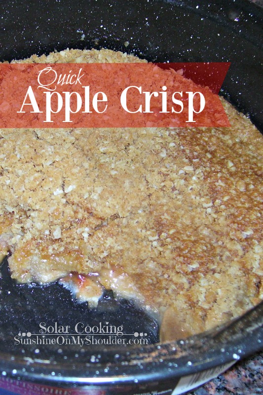 I baked this apple crisp in my granite ware pan in the All American Sun Oven. The time it takes to bake in a solar oven depends on the type of solar oven you are using, the weather, and how focused the oven is to the sun. My Apple Crisp took about 1 1/2 hours to cook on a hot sunny day. The oven temperature was at 325 degrees.