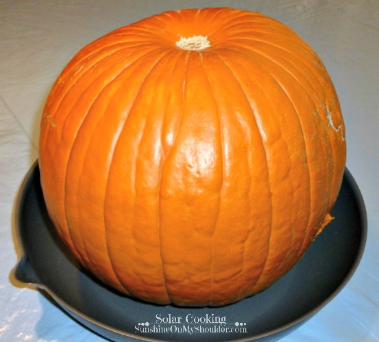 This time, I used a Global Sun Oven. In order to fit the pumpkin into the Sun Oven, use a small, soccer ball sized, pumpkin. Wash, but do not cut, the pumpkin. Leave it whole and place it in a dark, solar safe, pan.