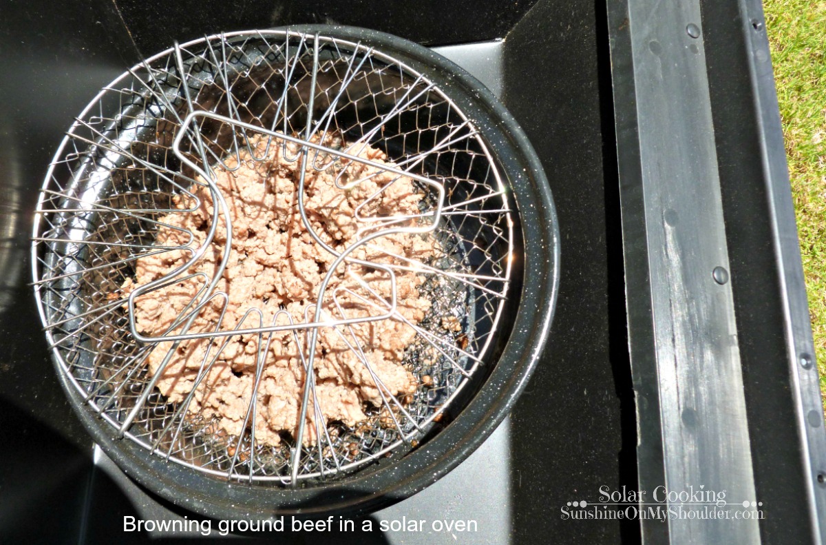 Many casserole dishes call for browned or cooked ground beef as an ingredient, and it is nearly impossible to convert a recipe calling for cooked beef to one starting with raw hamburger. But it makes little sense to heat up the stove to cook the beef,and then just use the solar oven to finish heating up a meal. Although it takes a bit of watching and stirring, hamburger can be browned in the solar oven.