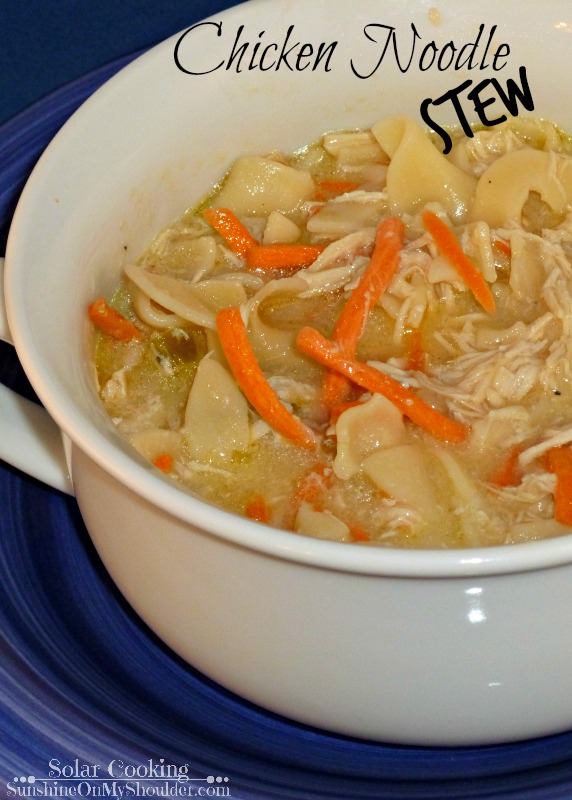 Put all ingredients, except the noodles, into a stockpot and put into the solar oven. Cook covered, about 3 hours, until the chicken is tender. Shred the chicken, Add the noodles. (The noodles will absorb some of the liquid. Depending on how much liquid there is and how “soupy” you like it, you may need to add additional broth or water.) Return the stock pot to the solar oven for about 1 hour to let the noodles cook.