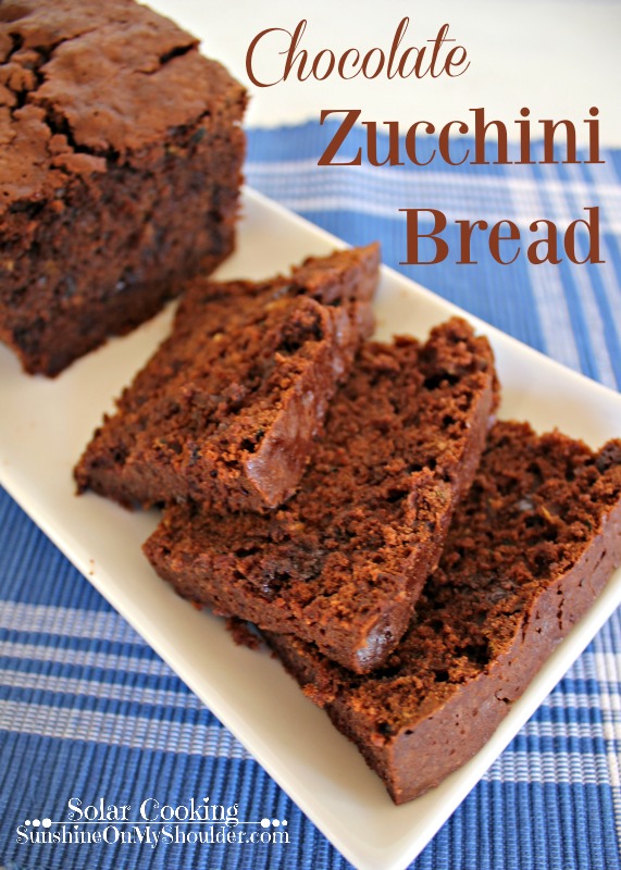 Quick breads are very easy to make and bake very well in a solar oven. Chocolate Zucchini Bread has a moist texture and a rich chocolaty flavor. I baked my bread in two bread pans in the All American Sun Oven, for two hours at 325 °F on a clear, hot sunny day.