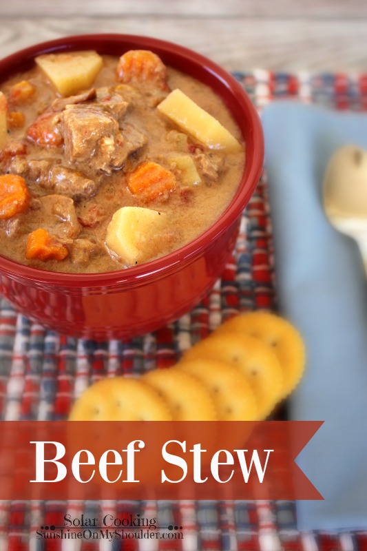 I never really thought about the recipe for Beef Stew. It is just one of those dishes that I learned in my mother’s kitchen all those many years ago. Just memorize it and do it. Beef Stew can be made from fresh ingredients, but it is also a great way to use up leftovers from the fridge. Just throw it all together in a pot and simmer. At first, I simmered it for hours on the stove, stirring frequently to keep it from burning on the bottom. Then, slow cookers were invented and they were perfect for my Beef Stew. I would start it in the morning, and when I got home from work, the stew was ready. These days, more often than not, my Beef Stew is cooked in my solar oven.