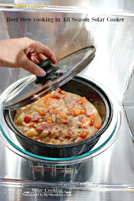 When solar cooking, smaller pieces of food cook faster than larger pieces. Furthermore, foods do not burn in a solar oven. Long cooking times are very forgiving and just make the meat more tender. Both cookers sat side by side the entire time, but because of the temperature drop when it sprinkled, I left the Beef Stew out for 4 – 4.5 hours. Although, the stew in the Sun Oven was probably done sooner, I brought them inside at the same time. The stew in each pot was cooked the same, looked the same, and tasted the same. We could not tell the difference between the two pots.