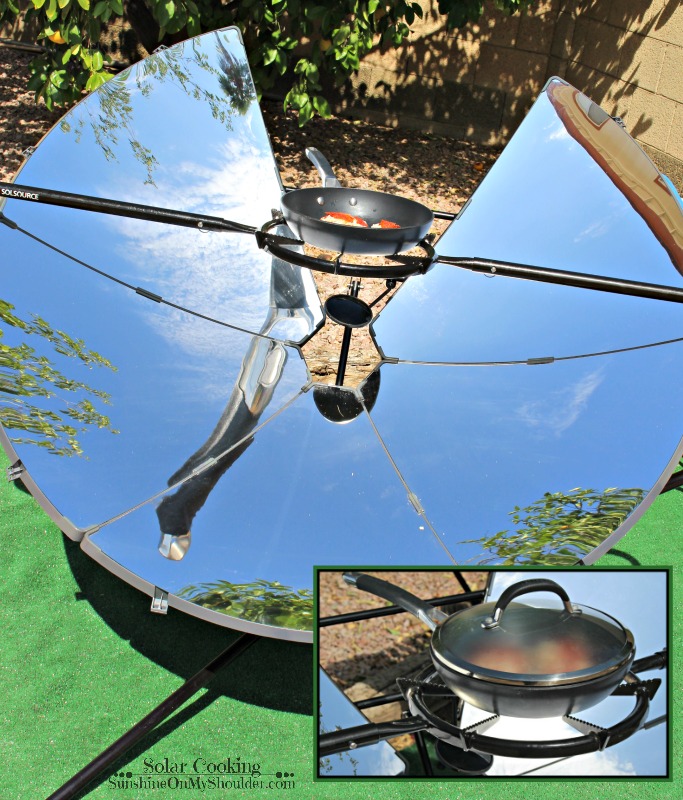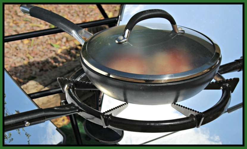 Since Eggplant Pizza for Solar Cooking needs a high temperature, I used the Solsource Solar Stove. The Solsource is a parabolic solar cooker that reaches very high temperatures, much like a kitchen stove top.