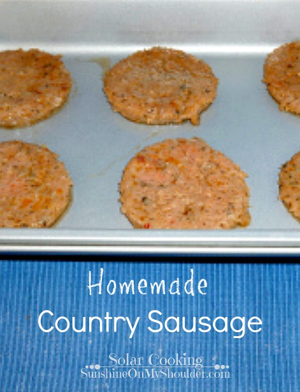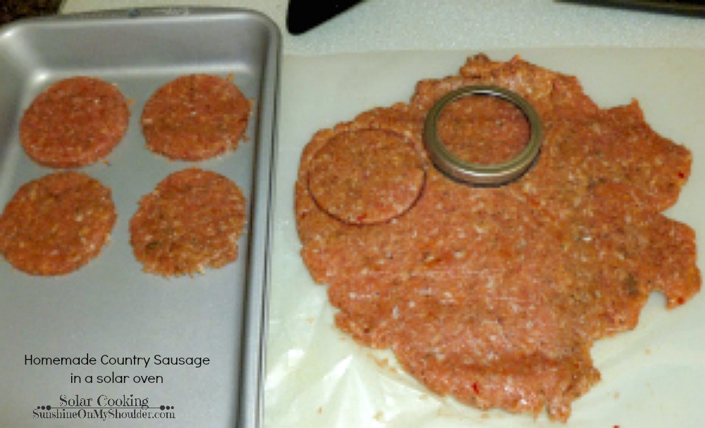 Country sausage can be cooked in a solar oven. Just combine ground pork and your favorite spices. Make it mild or wild. You decide.