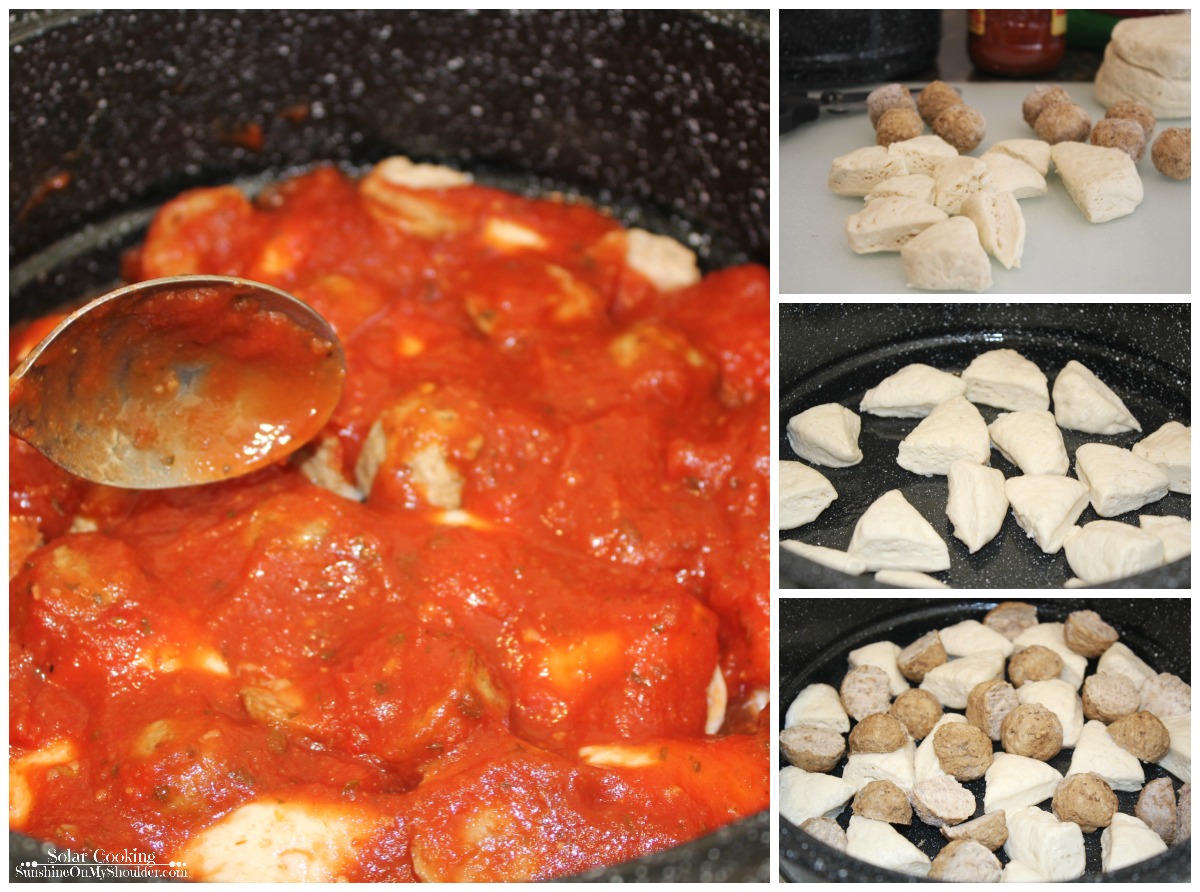 Meatball Sub Casserole is a solar cooking recipe. Because the recipe uses canned biscuits and precooked meatballs, this recipe cooks fairly quickly. Food cooks quicker in a solar cooker or solar oven if the food is cut into small pieces. Therefore, I cut the biscuits into 6 pieces each and laid them in the bottom of a solar safe pot sprayed with cooking spray. Even though the meatballs were precooked, I also cut them in half so that they would cover the pot more evenly. And finally, I covered the biscuits and meatballs with the pasta sauce.