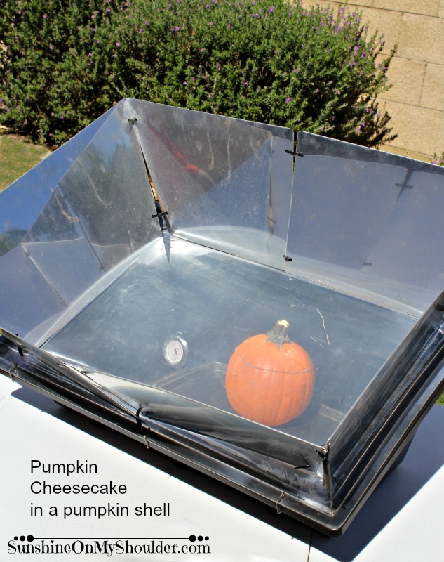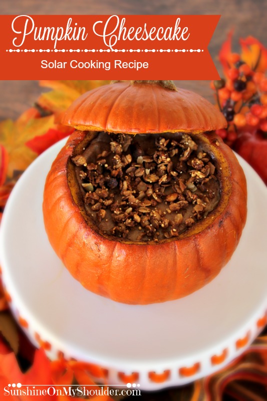 I baked my Pumpkin Cheesecake in a Solavore Sport Solar Oven. The time it takes to cook in a solar oven varies depending on how hot the oven gets. The temperature varies depending on the type of solar cooker you are using, the weather, and how focused the oven is to the sun. For more information, read How Long Does It Take to Cook In a Solar Oven. My pumpkin baked about 45 minutes and then the Pumpkin Cheesecake filled shell baked for about another hour.