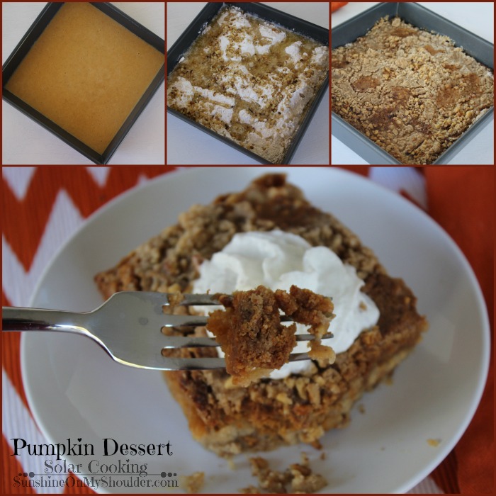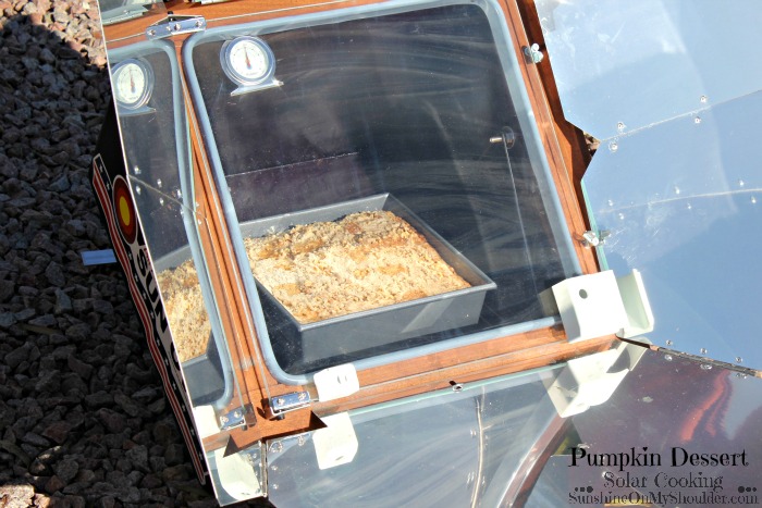 - Place into the hot solar oven uncovered. Bake for 2-3 hours. The dry mix will cook into the moist pumpkin batter and will brown on the top, depending on the solar oven and length of cook time.