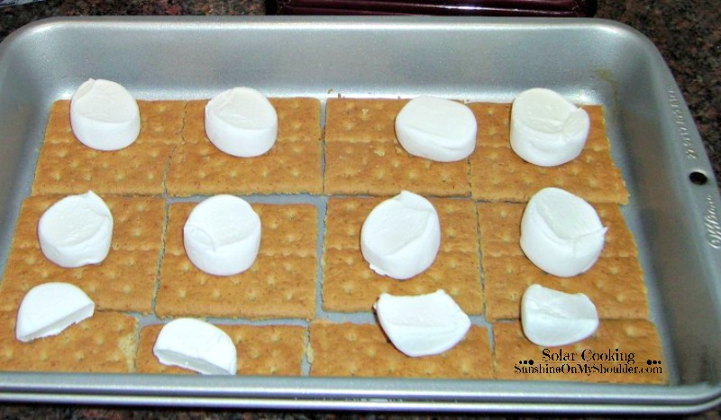 I put a layer of graham crackers in the bottom of a cookie pan. Since I only had large marshmallows, I cut them in half and put a piece on each cracker.