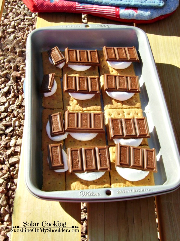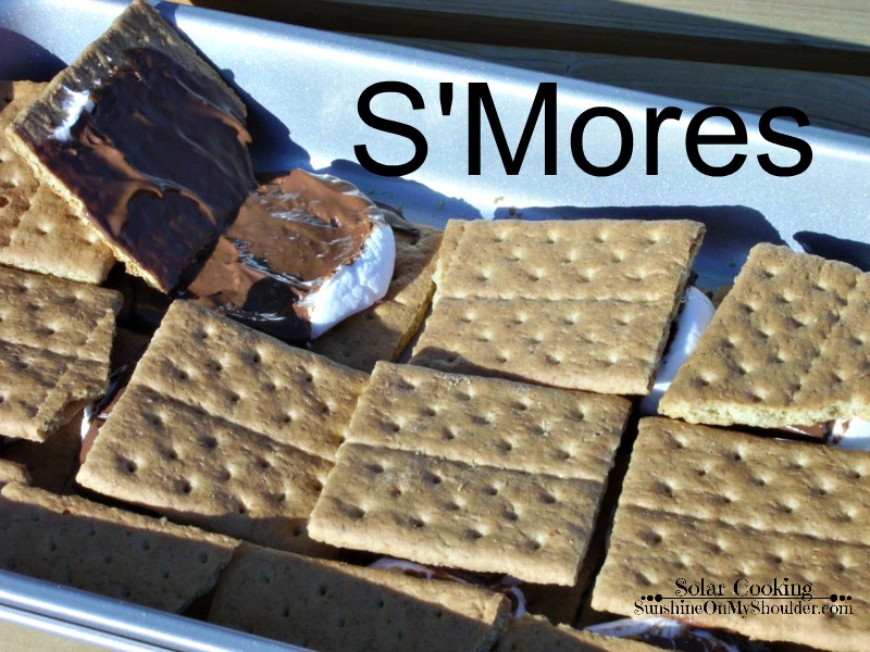 The time it takes to cook in a solar oven depends on the type of oven you are using, how focused it is to the sun, and the sky conditions. I thought that the marshmallows would take a bit longer than the chocolate to melt. In fact the oven just didn’t have time to get really hot that day, and it took longer to get the marshmallows hot than I had thought.