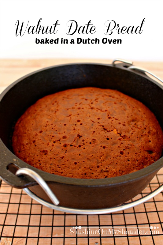 I recently made this delicious Walnut Date Bread. Although I usually bake in my solar oven, the day was looking a little cloudy and I didn’t know if I would have enough sun to heat the solar oven as long as it would be needed to bake the bread. The main drawback to using a solar oven is the fact that, if there is no sun, there is no cooking. In such a case, there needs to be an alternative cooking method. For us, one of those methods is using a Dutch Oven. But just like with anything else, you have to practice the skill in order to be able to be able to use when you need it. And this was the perfect opportunity to practice our Dutch Oven cooking skills.