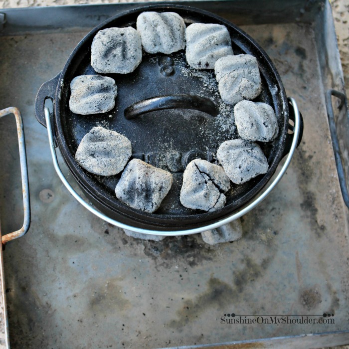 Cooking in a cast iron Dutch Oven is really pretty simple. However, it does take a little bit of tending. The first thing that is needed is a stack of white hot coals. Read here to learn how to start charcoal. We used an 8 inch Dutch oven. The temperature of a Dutch Oven is regulated by the number of coals that are used. We wanted a temperature of 325°F. So the formula calls for 6 hot coals on the bottom (8″ – 2 = 6 coals) and 10 hot coals (8″ + 2 = 10) on the top. Once the coals are in place, the Dutch oven must be rotated a quarter of a turn every 15 minutes to evenly distribute the heat and keep the food from burning. So the pot is turned 1/4 turn clockwise and the lid is turned 1/4 turn counter-clockwise every 15 minutes. Read here to learn exactly How to Cook in a Dutch Oven.