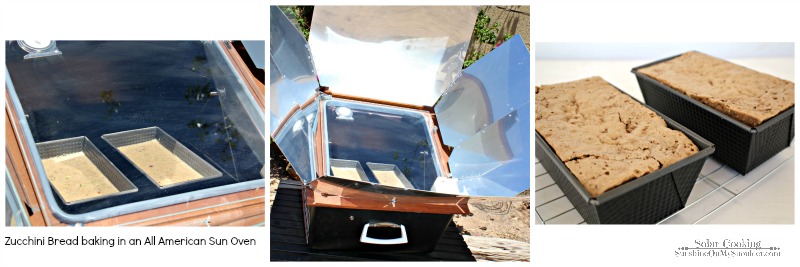 I baked my Zucchini Bread in an All American Sun Oven for 1 1/2 hours at 300 degrees F. The time it takes to cook in a solar oven will vary depending on the type of oven, the weather and how focused the cooker is to the sun.
